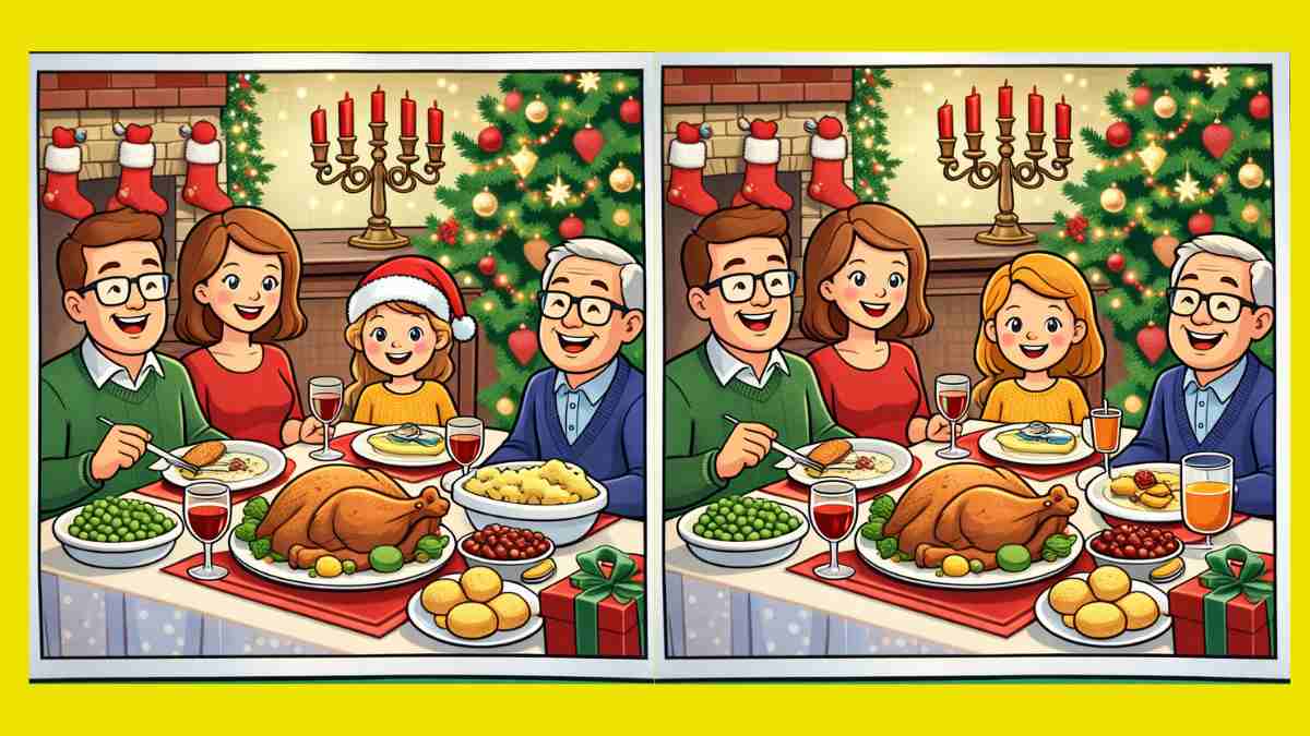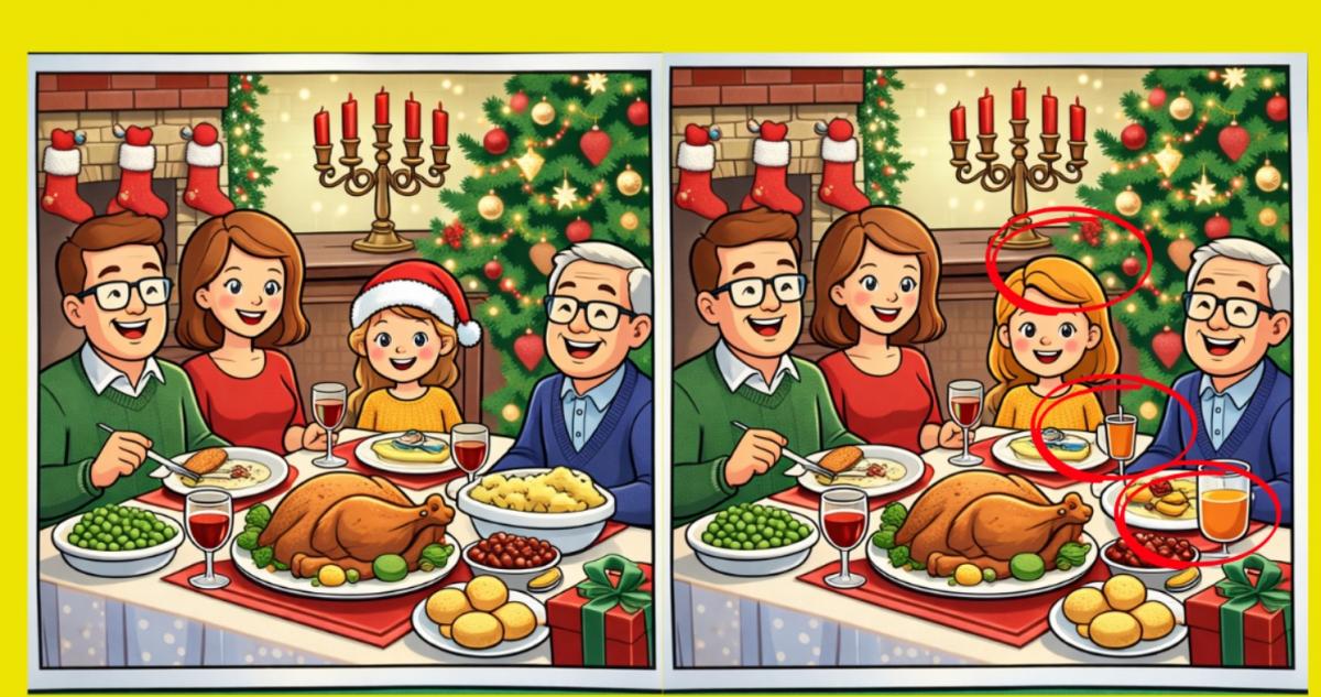 Så, är du redo för nästa utmaning? Ta en närmare titt på två bilder av en julmiddag med familjen. De kan se likadana ut vid första anblicken, men det finns 3 små skillnader som gömmer sig i dem. Tror du att du kan hitta dem alla på 16 sekunder? Prova och testa din synskärpa!