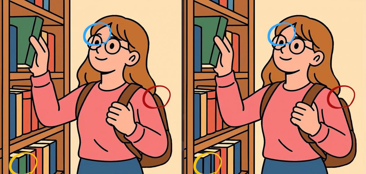 Så, är du redo för nästa utmaning? Ta en närmare titt på två bilder av en flicka som väljer böcker i ett bibliotek. De ser kanske likadana ut vid första anblicken, men det finns 3 små skillnader. Tror du att du kan hitta dem alla på 19 sekunder? Prova och testa din synskärpa!